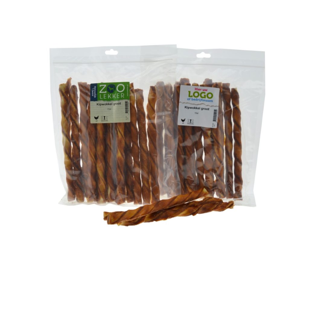 Kipwokkel groot Artikelnummer: 17461 EAN: 8720195059950 per 15st Samenstelling: Kip 56%, rawhide 38%, aardappelzetmeel 4%, glycerine 1,75%, plantaardige eiwitten 0,25%. Analyse: Ruw eiwit 49% Ruw vet 2% Ruwe celstof 1% Ruwe as 3% Vocht 18%