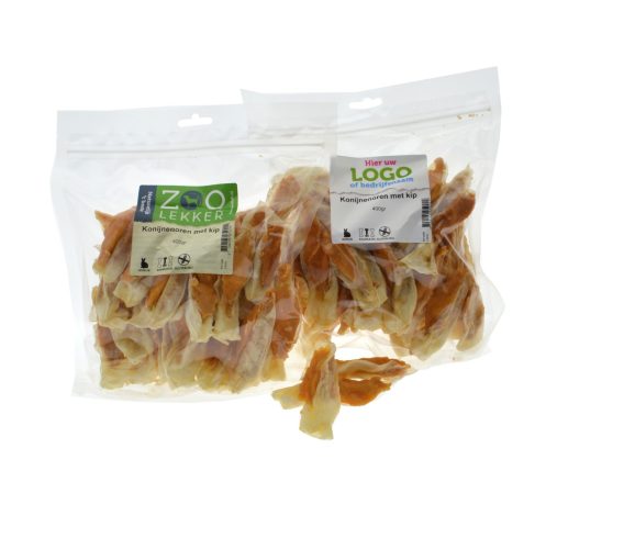 Kip 77%, konijnenoor 15%, aardappelzetmeel 2,5%, soja-eiwit 0,6%, pinda-eiwit 1,2%, erwten-eiwit 0,8% Zout 0,2%, glycerine 1,5%, plantaardig eiwit 1,1%, kaliumsorbaat 0,1%.