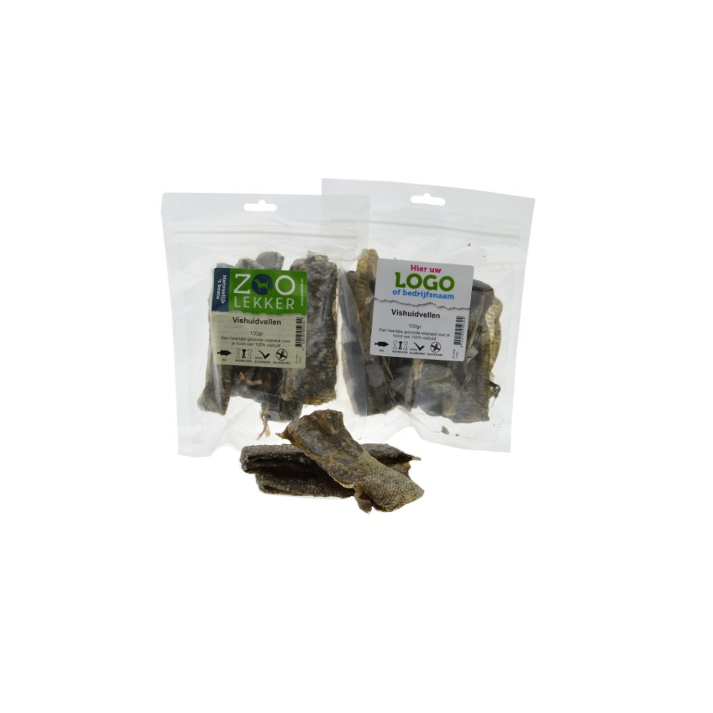 Vishuidvellen Artikelnummer: 17430 EAN: 8720195059394 per 100gr Samenstelling : 100% kabeljauwhuid Analyse: Ruw eiwit 50 %, Ruw vet 12%, Ruwe celstof 0,2%, Ruwe as 4,5%, Vocht 14%.