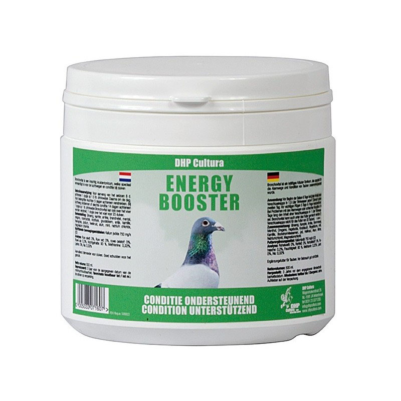 Energy Booster is samengesteld uit biologisch hoogwaardig eiwit met voor duiven alle noodzakelijke toevoegingen als essentiële en non essentiële aminozuren, vitamine, mineralen, stuifmeelnectar en sporenelementen. Daarnaast bevat DHP Energie Booster de speciale aminozuur L-Carnitine, creatine plus, en HM: een leucine derivaat.