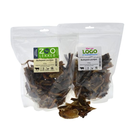 Bullepeespuntjes, de afsnijdsels van de bullepezen. Ideaal als tussendoortje of kauwsnack voor (kleine) honden.