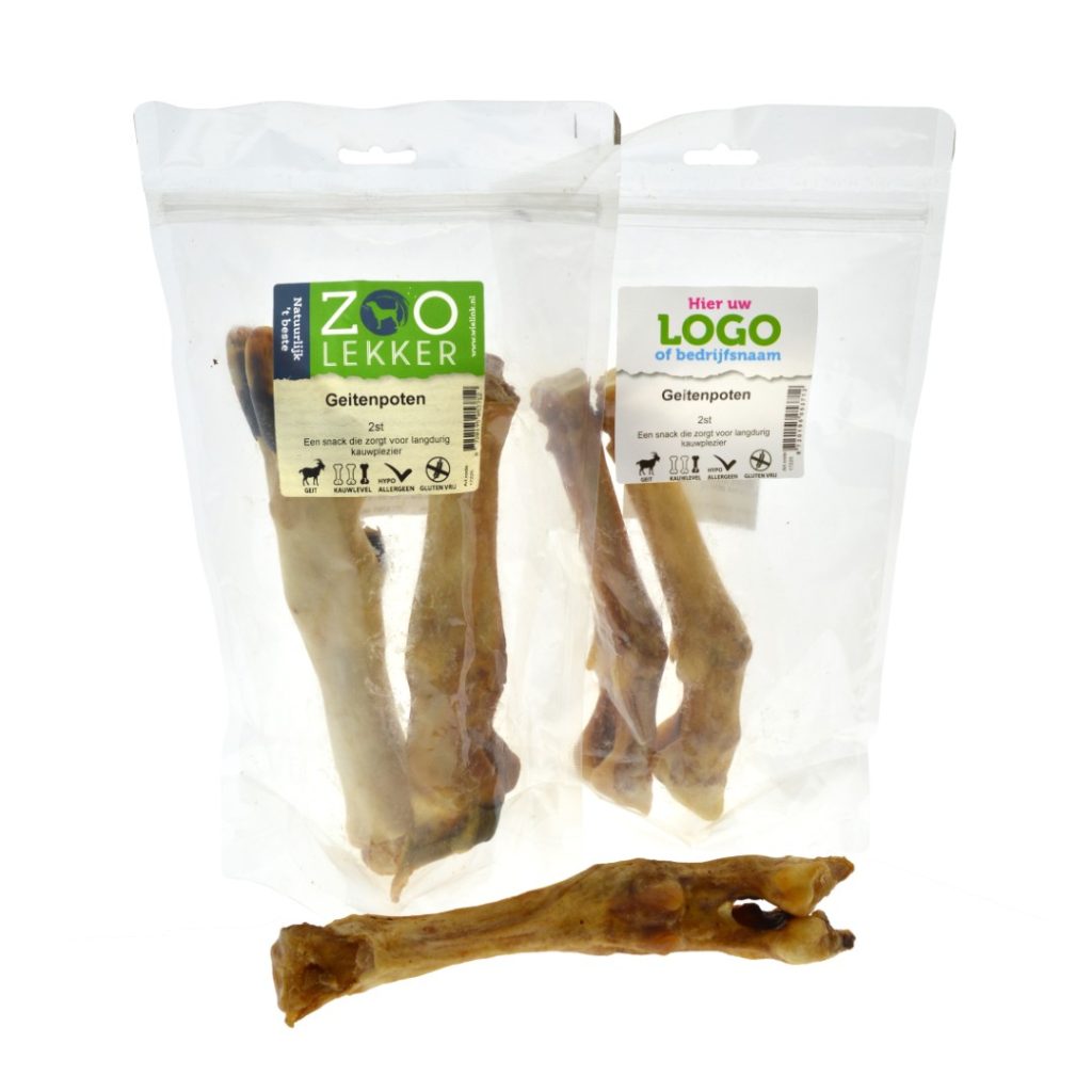 Geitenpoten hondensnacks als dagelijkse beloning of tussendoortje voor een hond. De poten van de geit zijn gedroogd voor een lang kauwplezier. De Geitenpoten zijn glutenvrij en hypoallergeen.