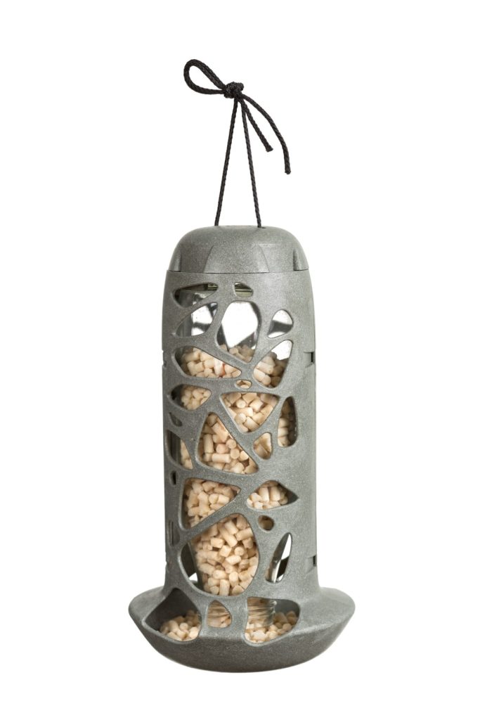 Tara is voor gemaakt van gerecycled materiaal en is multifunctioneel. De houder is geschikt voor vetbollen en kan met de bijgeleverde glazen fles in een handomdraai worden veranderd in een zonnebloempitten- of vogelzaaddispenser.